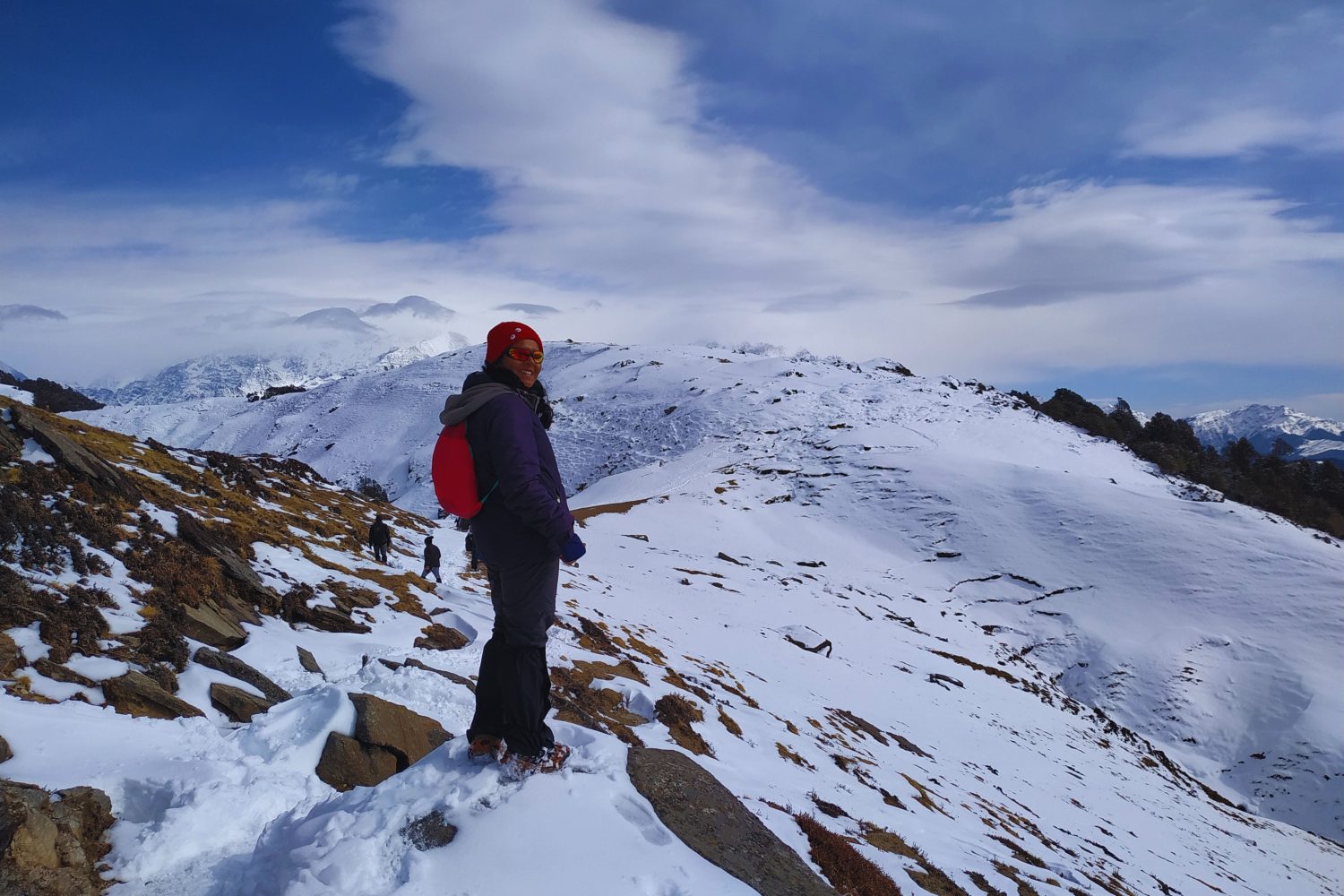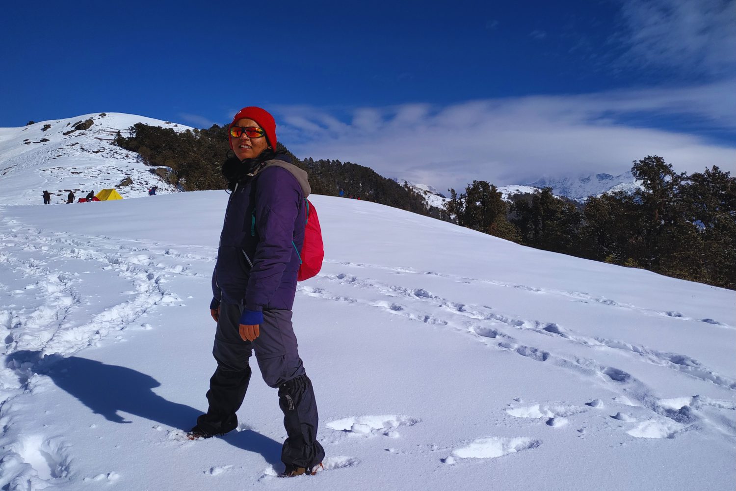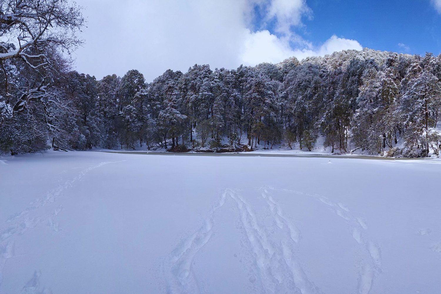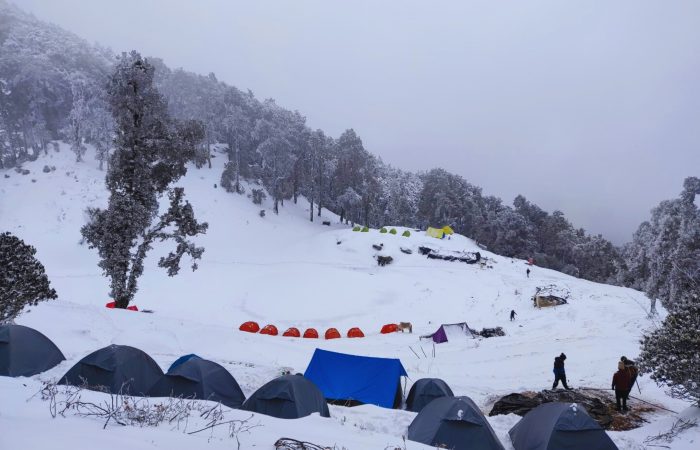 The day’s trek takes you to the enchanting frozen lake of Bekaltal, nestled in the forest. In winter, the lake is covered in ice, creating a magical sight. From here, continue climbing through snow-covered trails until you break out above the tree line, reaching Tilandi Top at 3,200 m. The open meadows offer unobstructed views of the Garhwal and Kumaon ranges. Camp overnight in the crisp mountain air.