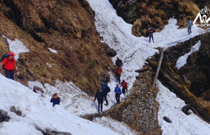 The trail from Agoda to Manjhi is a beautiful journey through dense forests, gentle ascents, and scenic ridgelines. As you move deeper into the wilderness, you’ll be surrounded by oak, rhododendron, and pine trees, with occasional clearings offering stunning views of the valley below. The serene village of Manjhi, nestled amidst meadows and forest patches, makes for a peaceful campsite and a great spot to unwind after a long day’s trek. This stretch offers a perfect blend of nature, solitude, and gradual acclimatization.