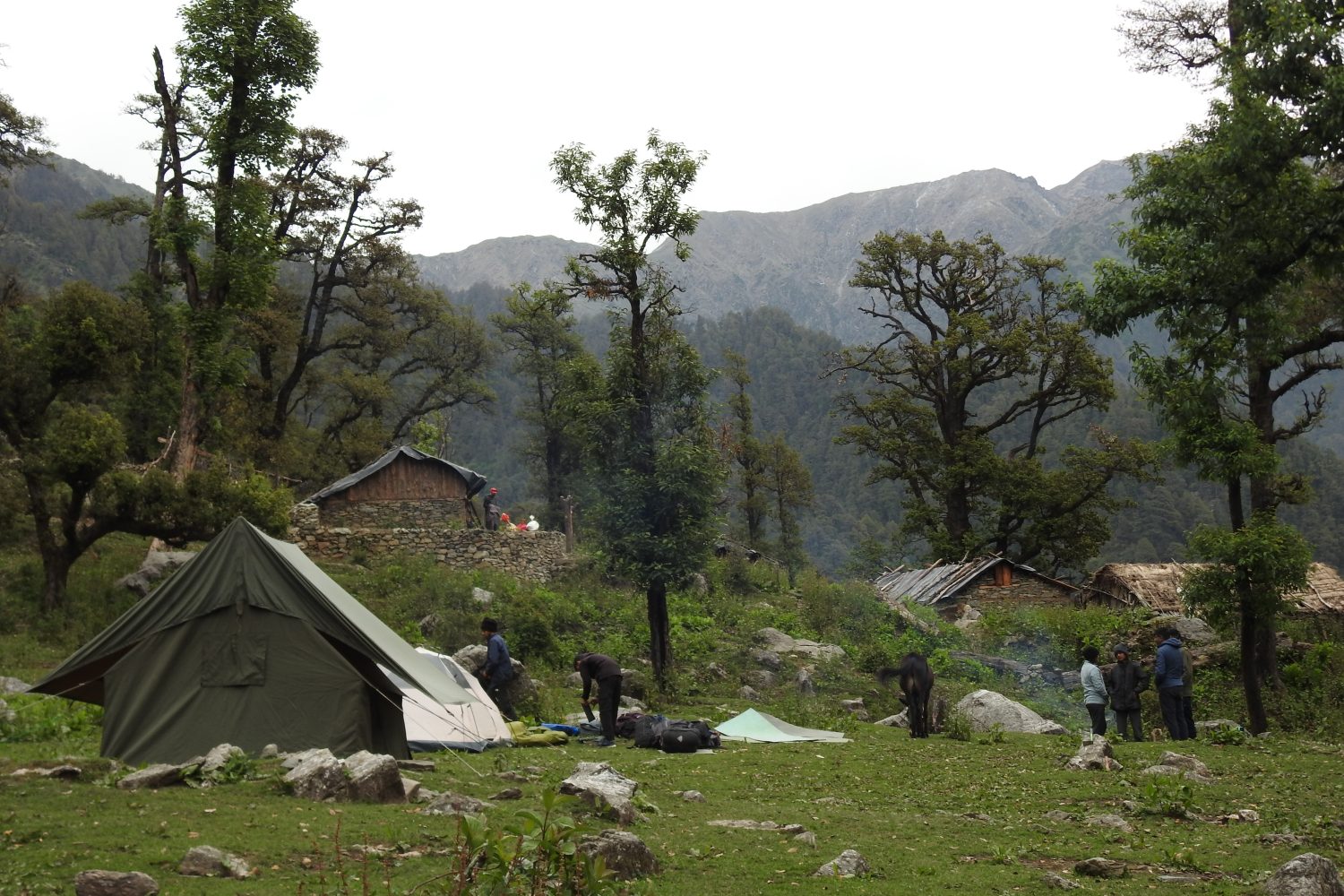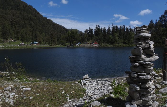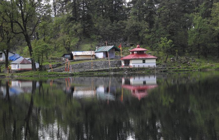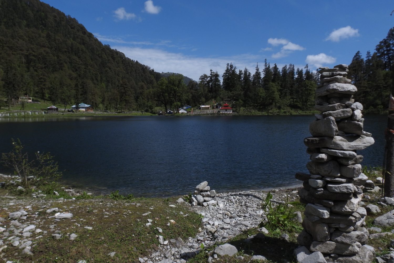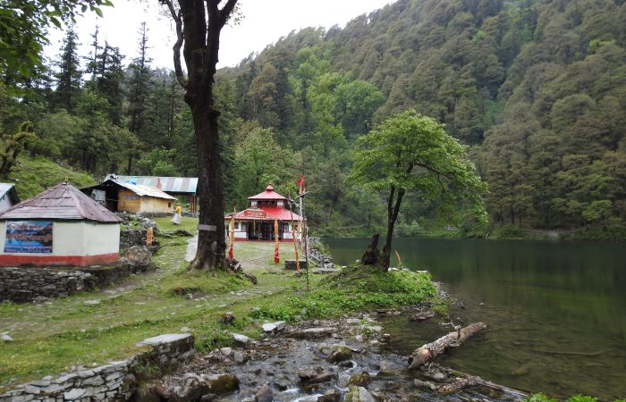 Today’s trail takes you on a gradual ascent through dense oak and rhododendron forests, with occasional clearings offering glimpses of the surrounding valleys. The route is peaceful and scenic, with birdsong accompanying your walk through the Himalayan wilderness. As you approach Dodital, the forest opens up to reveal the pristine lake—surrounded by pine trees and snow-dusted peaks. Revered as the birthplace of Lord Ganesha, Dodital Lake is not only a visual delight but also a place of spiritual calm. The emerald waters and tranquil setting make it an unforgettable campsite.