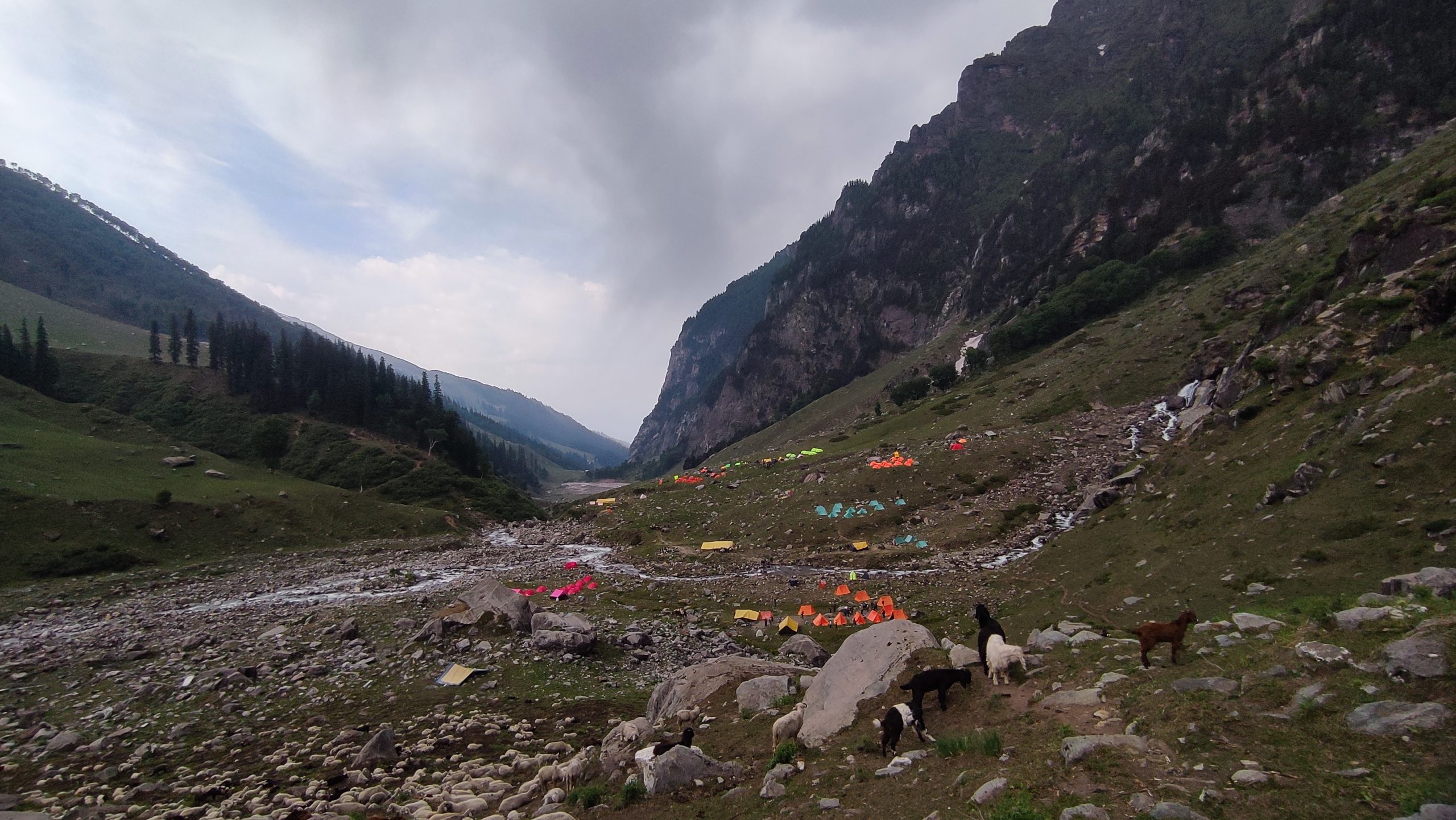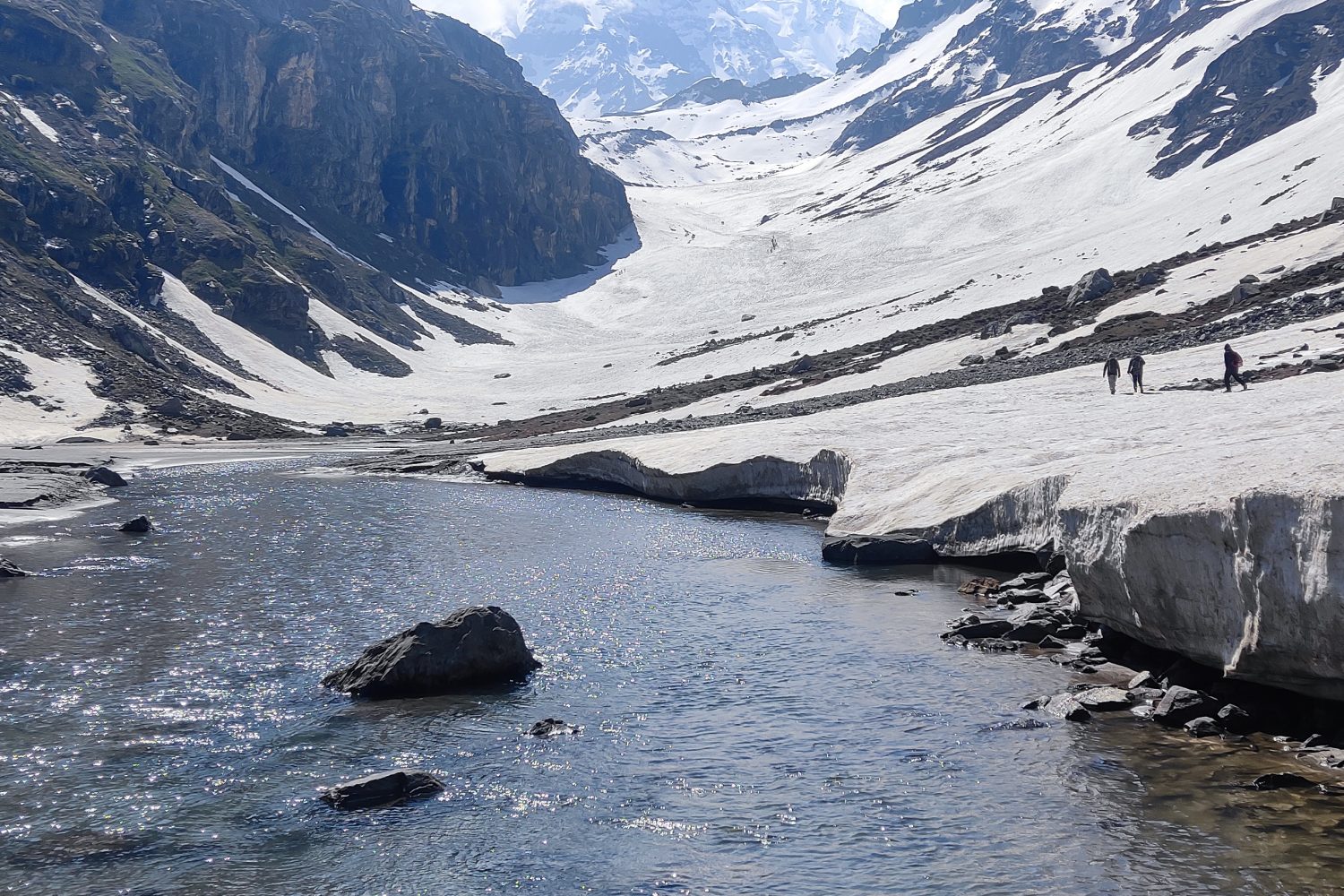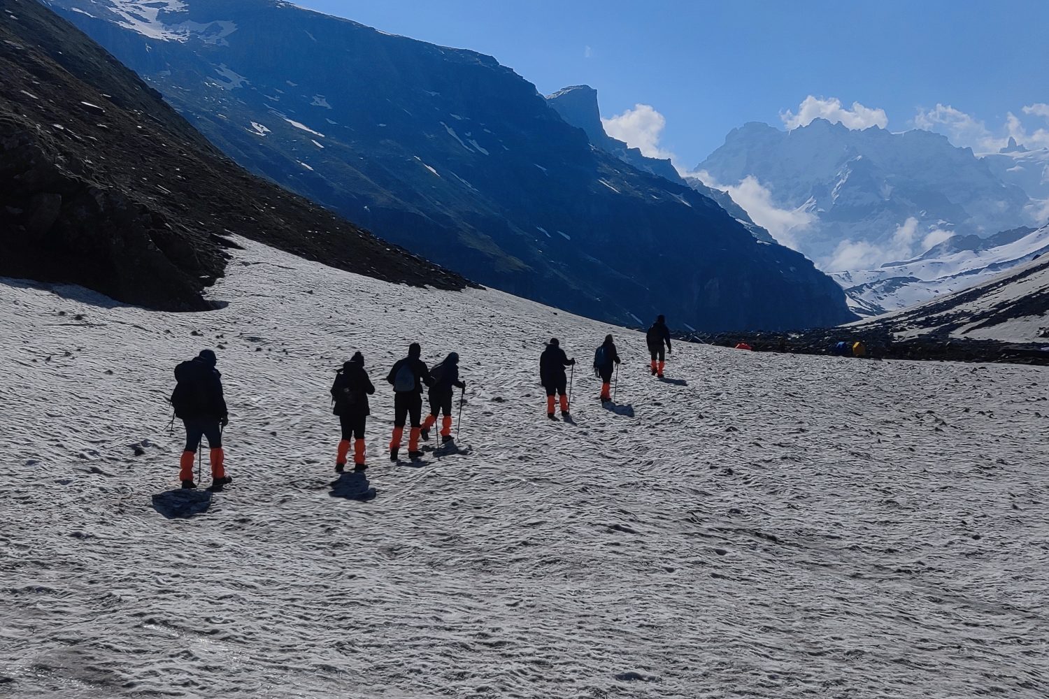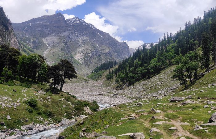 The day begins with a picturesque drive from Manali to Jobra, the starting point of the trek. After a safety briefing and gear check, you’ll begin your trek through lush pine, maple, and birch forests. The trail follows the Hampta River, gradually opening up into expansive meadows surrounded by towering peaks. The path is a gentle introduction to the terrain, ideal for warming up. Chika, your first campsite, is set in a stunning alpine setting beside the river, with panoramic views and fresh mountain air – a perfect start to your Hampta Pass adventure.