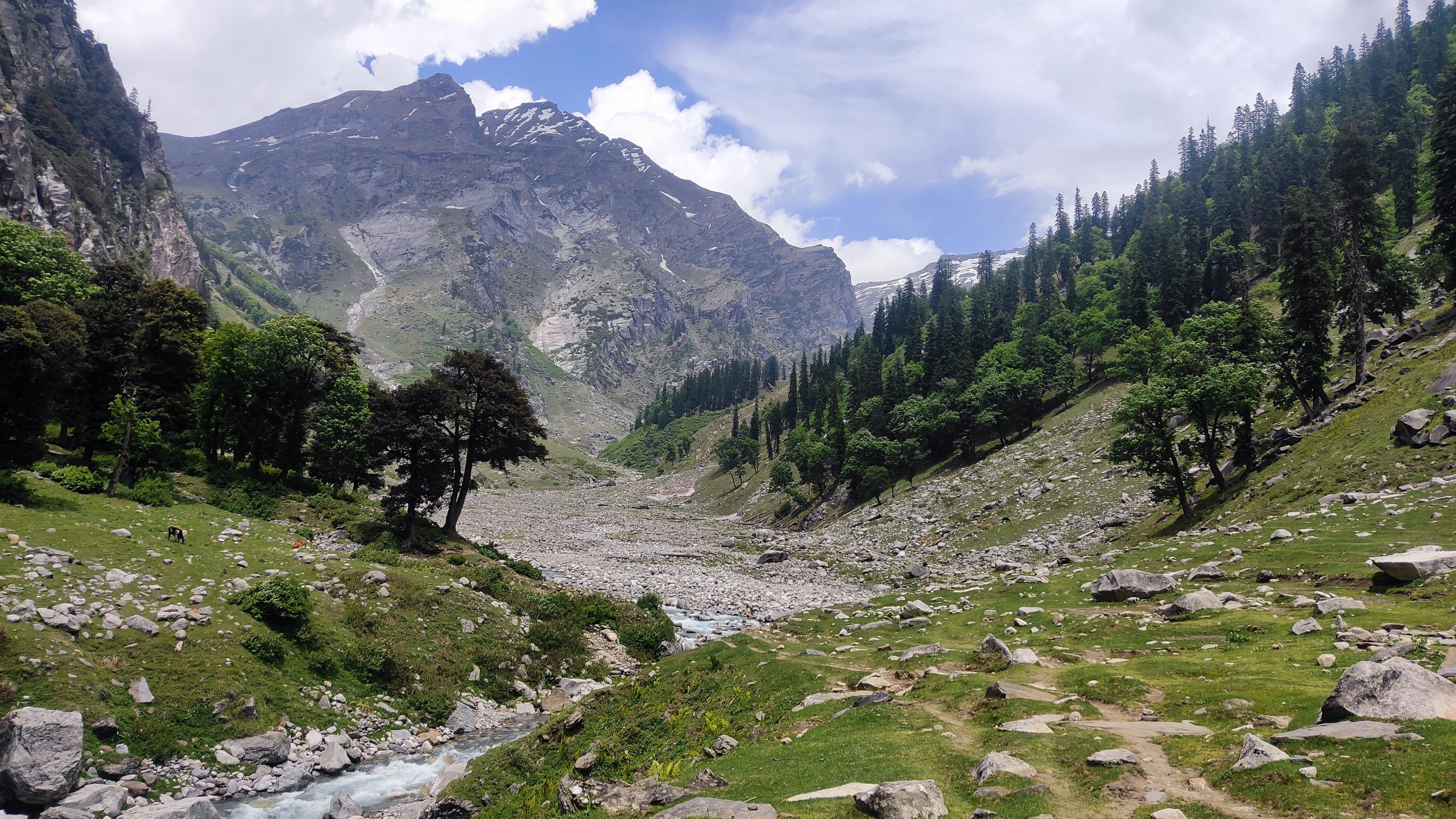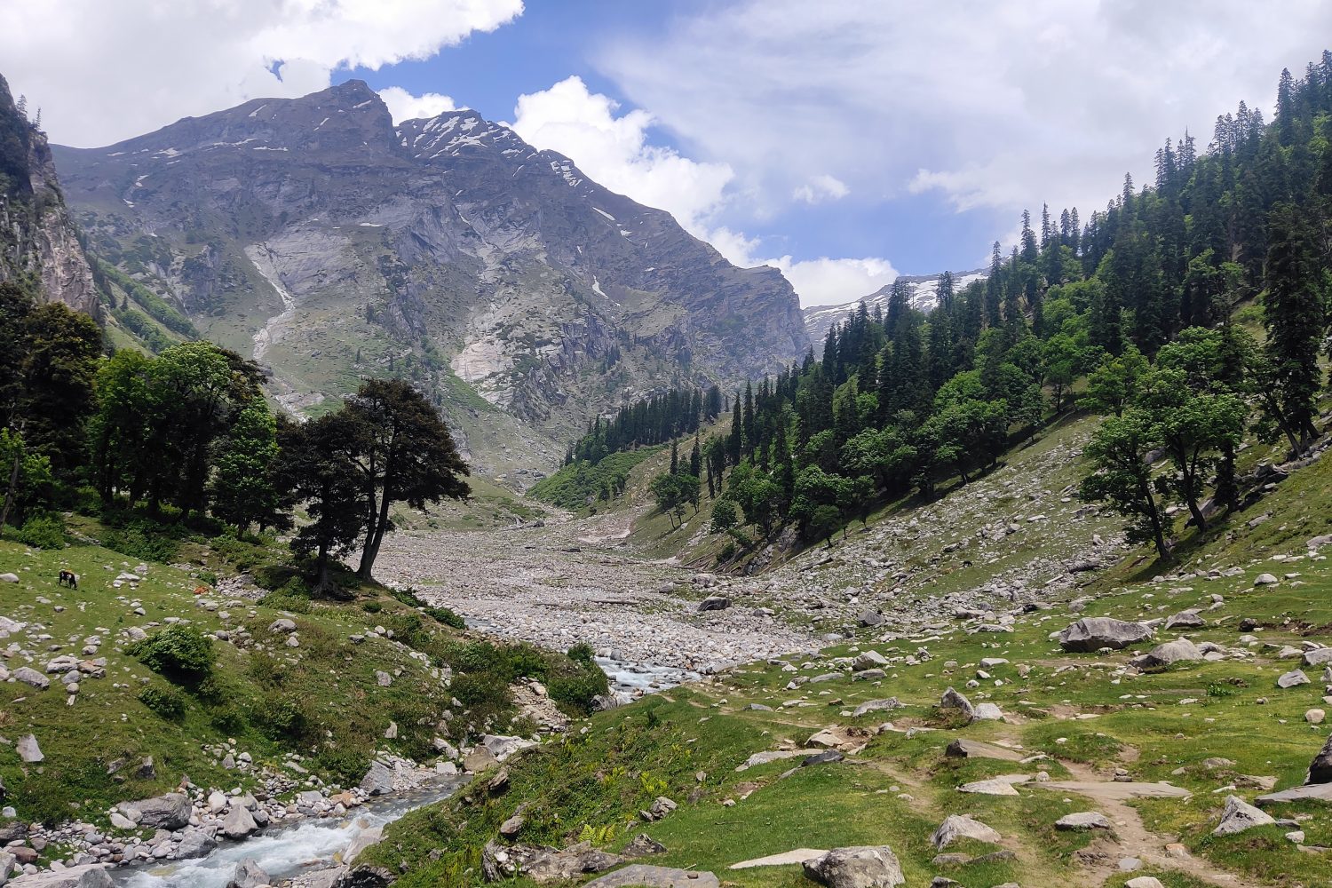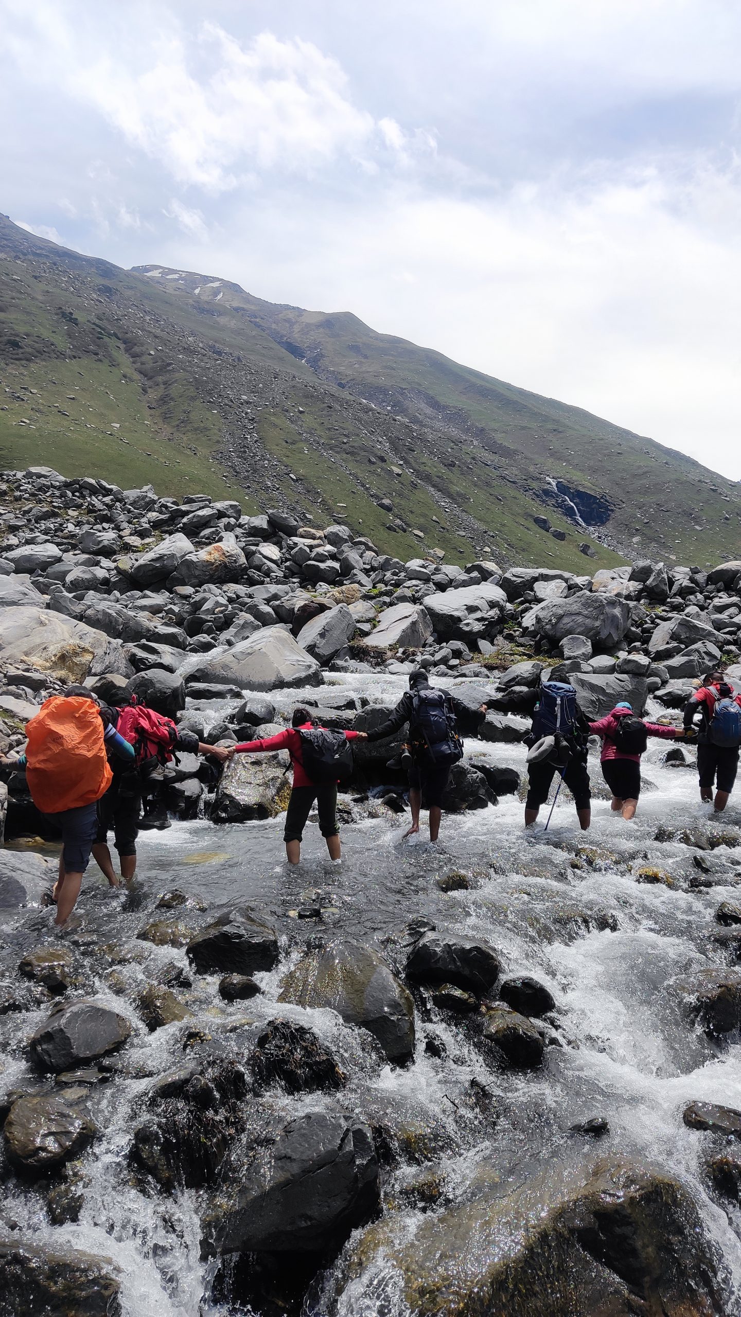 The day begins with a picturesque drive from Manali to Jobra, the starting point of the trek. After a safety briefing and gear check, you’ll begin your trek through lush pine, maple, and birch forests. The trail follows the Hampta River, gradually opening up into expansive meadows surrounded by towering peaks. The path is a gentle introduction to the terrain, ideal for warming up. Chika, your first campsite, is set in a stunning alpine setting beside the river, with panoramic views and fresh mountain air – a perfect start to your Hampta Pass adventure.