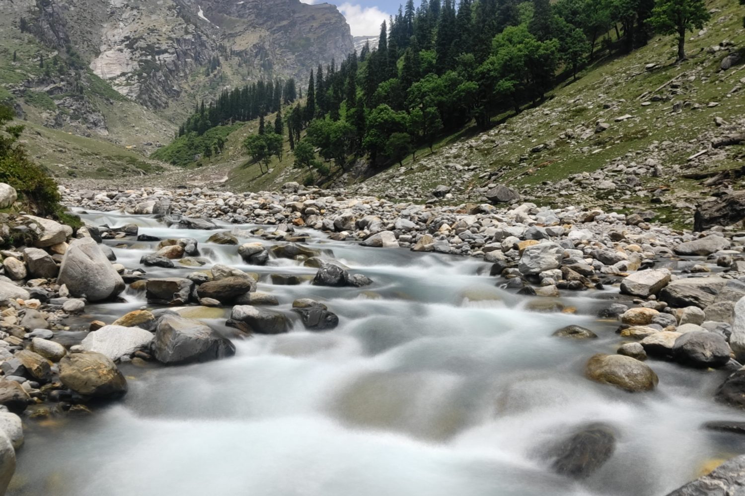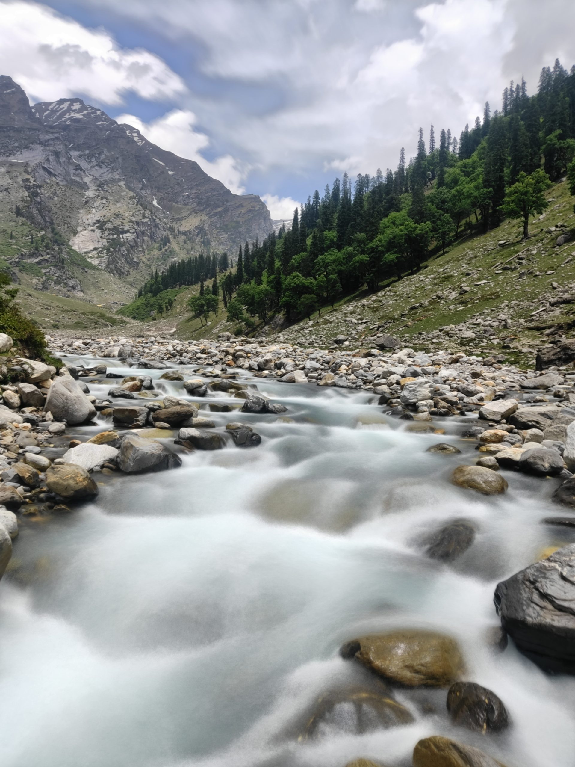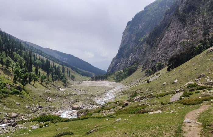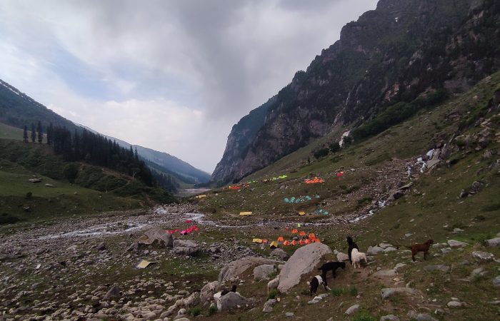 Today’s trek involves a steady ascent through vibrant wildflower-filled meadows and increasingly rocky terrain. The trail offers a beautiful contrast of lush greenery and rugged mountain features. As you gain altitude, the views become more dramatic, with the majestic Dhauladhar range slowly coming into full view. Along the way, listen to the sounds of the river and wind through high-altitude grasslands. Bhalu Ka Ghera, meaning “Bear’s Circle,” is a scenic campsite surrounded by raw Himalayan wilderness — a perfect place to unwind and soak in the mountain energy.