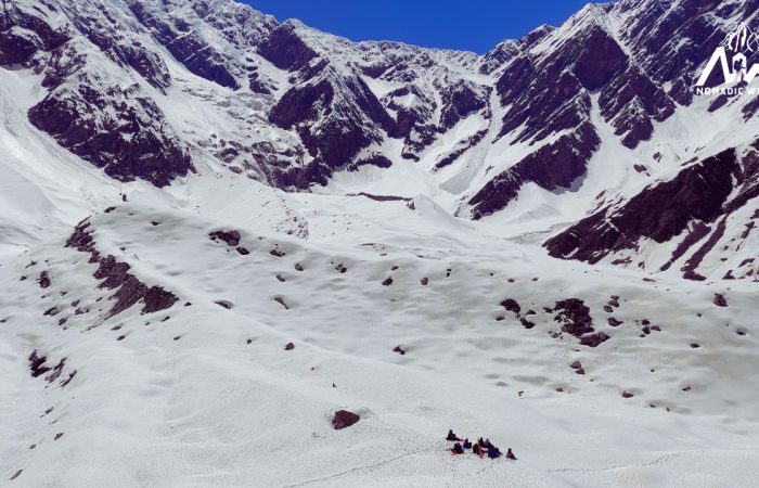 By afternoon, you reach Bhoj Gadi (3,400 m), a wide, scenic campsite surrounded by towering ridgelines and snow-clad peaks. The open setting offers a perfect spot for stargazing at night, with clear skies often revealing the dazzling Milky Way.