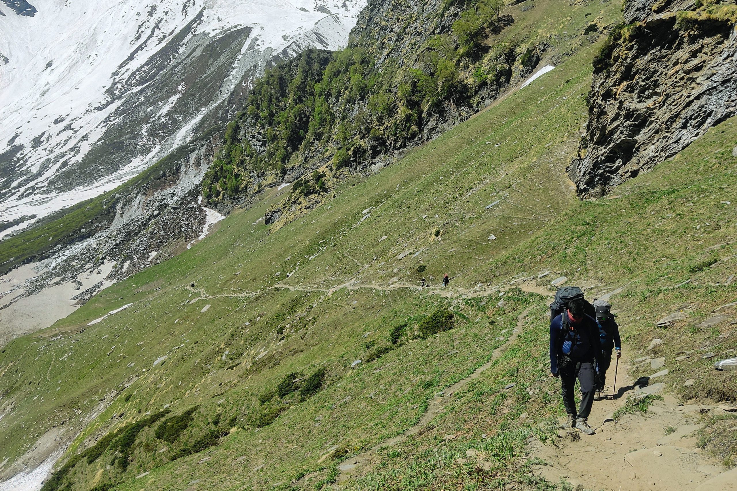 Today’s trek is short in distance but involves a steeper climb compared to yesterday’s. The trail ascends steadily from Bakarthatch through alpine meadows and rocky patches, gradually leading into snow-covered terrain as you gain height. By afternoon, you’ll reach Lady Leg campsite, beautifully set against the backdrop of towering peaks. This campsite gets its name from the distinct shape of the slope resembling a “lady’s leg.” From here, you get panoramic views of Friendship Peak, Manali Peak, and the surrounding ranges.